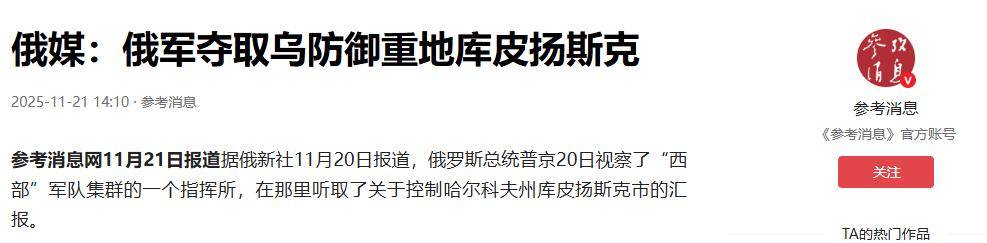 本报讯:俄乌战争对俄罗斯越来越有利,刚取得攻占红军城的胜利,库皮扬斯克之战也有了结果。俄罗斯媒体报道称,2025年11月20日,俄罗斯军队西部部队指挥官库佐夫列夫向俄罗斯总统普京报告,攻击乌克兰城市库皮扬斯克。该城与红军城一样为重镇,为乌克兰在哈尔科夫地区的重要据点,俄方称为:乌克兰防御体系中的关键一环。