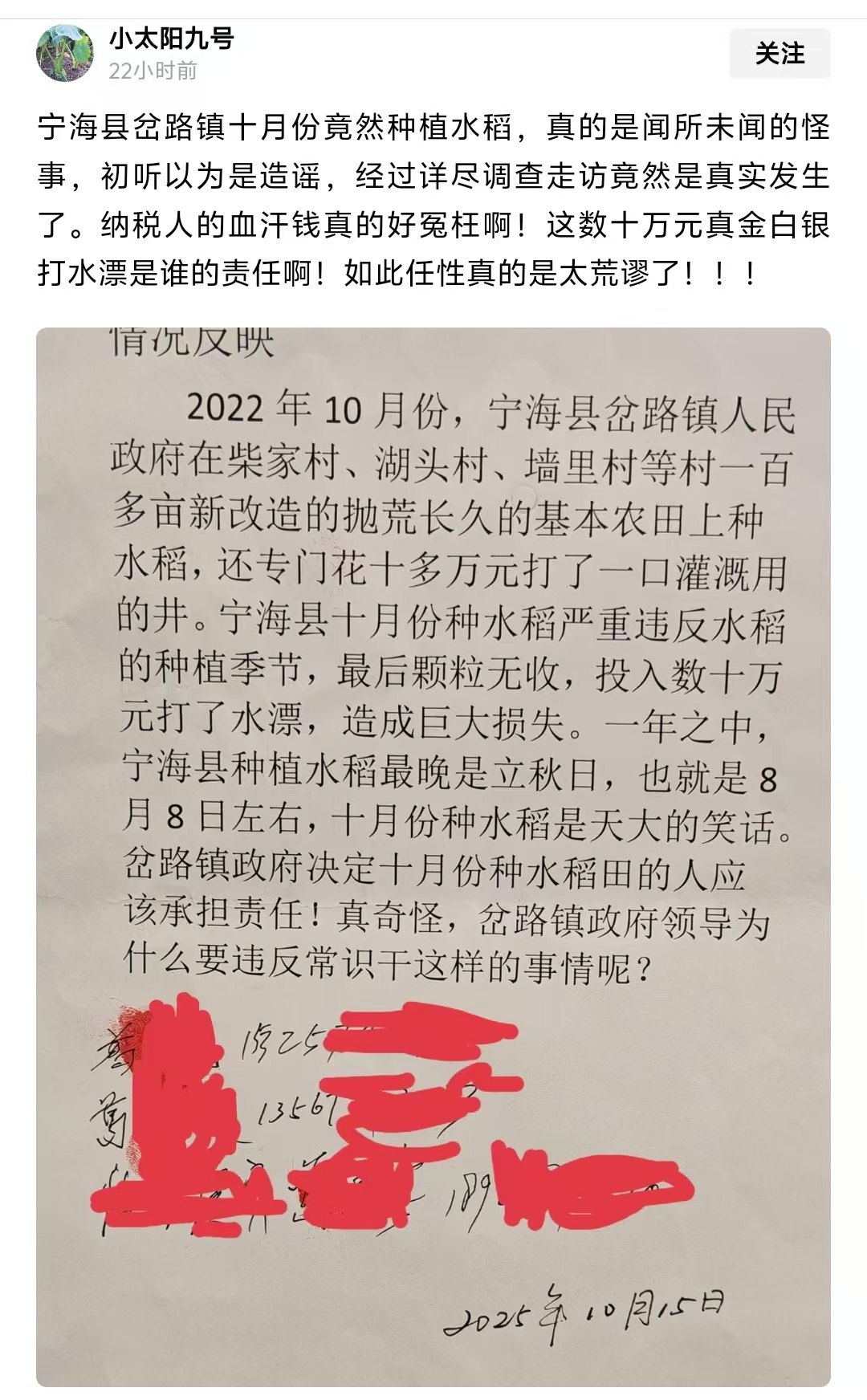 近日,宁海县岔路镇十月份种植水稻的新闻引发广泛关注。这一违背农时常识的行为,不仅造成数十万元财政资金打水漂,更折射出基层决策中的深层问题。根据宁海县农业农村局公开信息,该县水稻种植最晚需在立秋日(8月8日左右)完成,而岔路镇在10月种植水稻,实属罕见。更令人费解的是,镇政府还专门投入十多万元打井灌溉,最终却颗粒无收,纳税人血汗钱付诸东流。